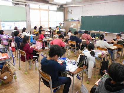 遠足が延期となり、教室でお弁当を食べました。給食とは違う雰囲気でした。