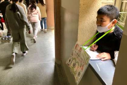 児童会の子どもたちが中心となって、あいさつ運動や廊下見守りの活動をがんばっています!(写真は、給食後の廊下見守り隊のようすです)
