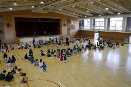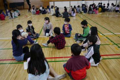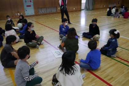 今年度初めての児童集会を行いました。密を避けて行うために、ペア学年ごとで集会を行うことになりました。