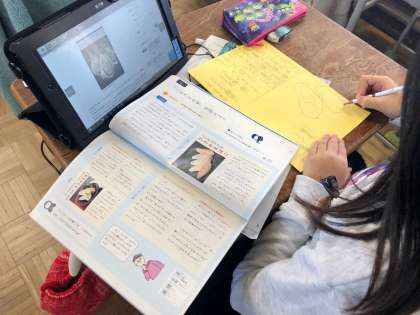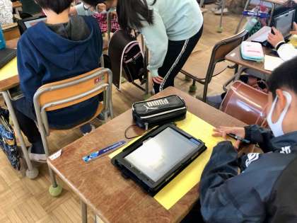 子どもたちが、タブレットを活用しながら、調べたことをパンフレットの形でまとめています。