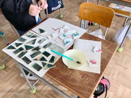 ていねいに絵の具で色塗りした作品にニスを塗って仕上げています。