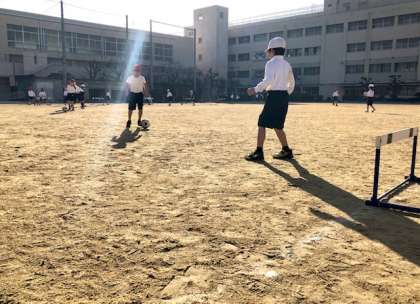 子どもたちはドリブルをしながら運動場を元気いっぱい走り回っていました!