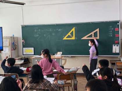 子どもたちは、教科書にある問題をどのようにすれば解くことができるのか、みんなの前へ出て発表をしている様子です。