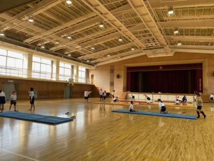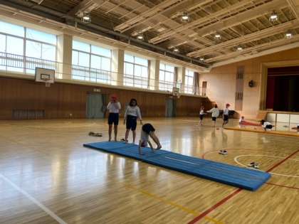 前転、後転から開脚前転、伸膝後転(しんしつこうてん)、3点倒立、倒立etc...