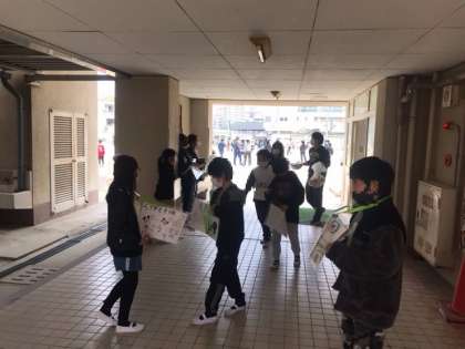今日から生活ふり返り週間・ろう下見守り週間が始まりました。昼休みのろう下を代表委員会の皆さんが見守り、安全通行をみんなに呼びかけています。