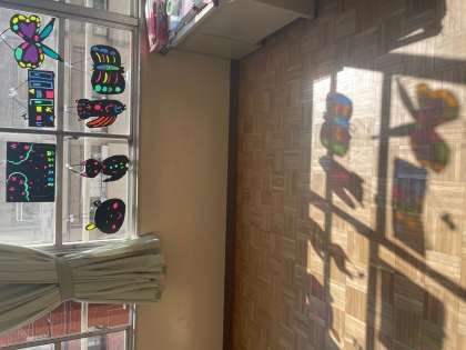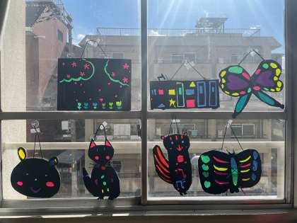 2年生では、図工で「ひかりのプレゼント」に取り組みました。カッターで模様を切り抜き、裏からカラーセロハンを貼ります。セロハンは赤・黄・青・緑の4色しかありませんでしたが、赤と青を重ねて紫にするなど、工夫して色を作っていました。