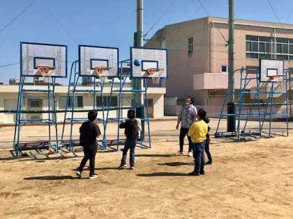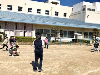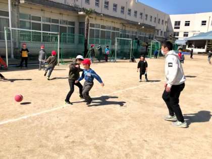 給食が終わり、運動場へ出て元気いっぱい遊んでいる様子です。