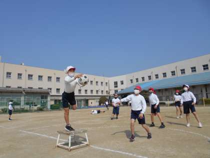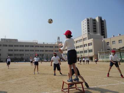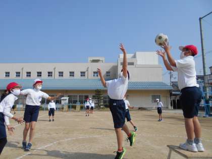 体育で「ポートボール」をしています。ゴールの前にいる相手をどのようにかわすのかを考えて活動しています。