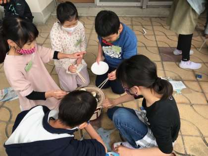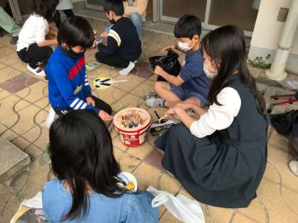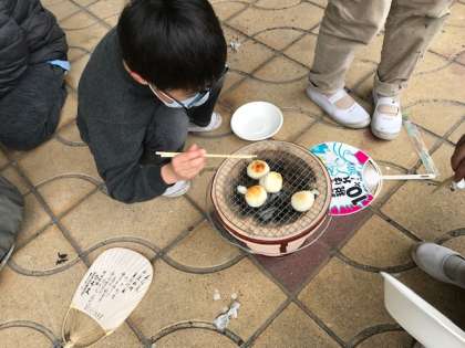 ?社会科の「昔のくらし」の学習の一環で、七輪でお餅を焼きました。マッチに火をつけたり、炭で火をおこしたりと、初めての体験ばかりで、子どもたちは悪戦苦闘しながらも、楽しく取り組んで