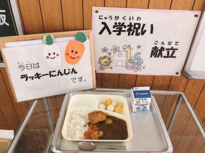 初日は入学お祝い献立「カツカレーライス フルーツ白玉 牛乳」でした。調理員さんが入学・進級のお祝いの気持ちを込めて、カレーライスの中にラッキーにんじん(かたぬきにんじん)もいれてくれました。