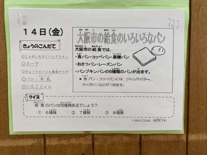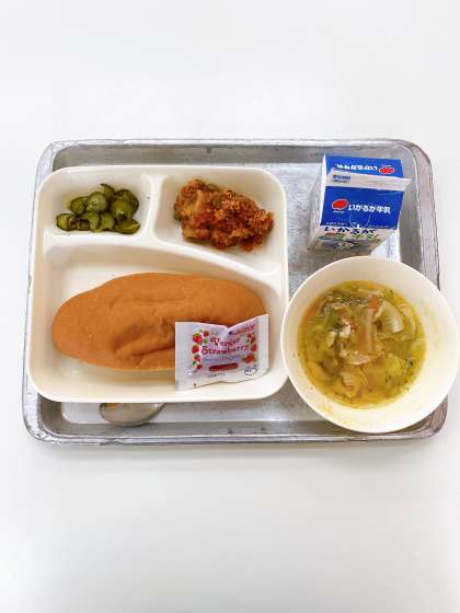 今日の給食は、じゃがいものミートグラタン.スープ.きゅうりのバジル風味サラダ.コッパン.牛乳.いちごジャムです。大阪市では6種類のパンが登場します。ほとんどのパンはその日に焼いたパンが学校に来ています。依羅小学校では、黒糖パンが1番人気です。