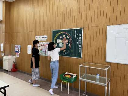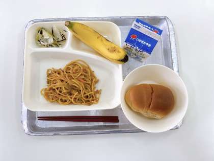 今日の給食は、カレースパゲッティ.キャベツのひじきドレッシング.バナナ.黒糖パン.牛乳です。給食委員会の児童が毎日、次の日の給食に出る食材を栄養黒板に掲示してくれています。6つの食品群に分けることは難しいですが、横の表を参考にしながら少しずつ法則性を見つけているようです。