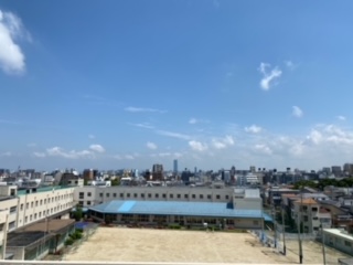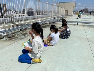 学校の屋上に行き、わたしたちのまちの様子を見てみました!東西南北のそれぞれの方位にはどんな建物があるのか、子どもたちは興味をもって取り組んでいました。自分の家を探してみたり、電車が通るのを待ってみたり、楽しく取り組むこともできました。
