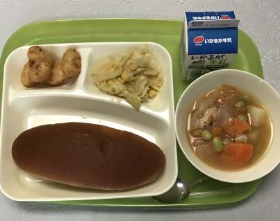 今日の給食は、いかてんぷら・フレッシュトマトのスープ煮・サワーソテー・パン・牛乳です。今日の給食委員会の放送は、「かむことについて」です。最近はよく噛まなくても食べられるやわらかい食べ物が増えています。しかし、よく噛むことによって顎が発達し歯並びがよくなったり・脳への血流がよくなって頭の働きがよくなったりします。噛むこととともに、食べるときの姿勢もご家庭でお声かけいただけたらと思います。