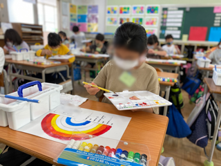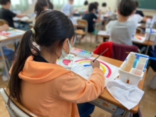 3年生から使い始めた絵の具にもだいぶ慣れてきた子どもたちは、にじを作りました。初めての混色にもチャレンジしました。