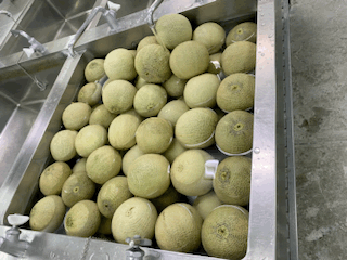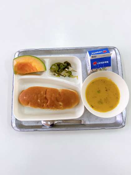 今日の献立は、かぼちゃのクリームシチュー.ミックス海藻のサラダ.クインシーメロン.おさつパン.牛乳です。今日はみんな大好きクインシーメロンの日でした。8等分に切って種を取っているところです。550人分のメロンが届きましたが、何玉届いたでしょう?