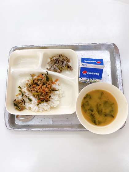 今日の給食は、豚肉とにらのそぼろ丼.キャベツの赤じそあえ.みそ汁です。にらは、地際から5cm残して収穫すると何度も葉が伸びてきます。1年間に4.5回、4.5年の長期収穫も可能だそうです。苗や種を植えてはじめに生えてくるにらを農家の方々の中で「1番にら」とも呼ばれ