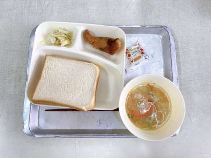 今日の給食は、サーモンフライ.豆乳スープ..サワーソテー.パン.牛乳です。今日は豆乳スープの中に、ラッキーにんじんが入っていました。今日の形は、ハートとダイヤでした。