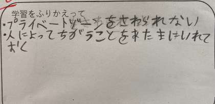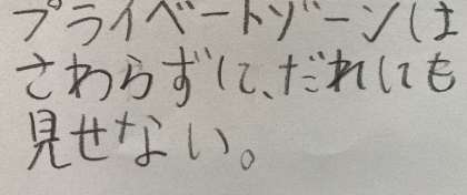 本日4年2組にて、「おしえてくもくん」という絵本を使い、「プライベートゾーン」に関する学習を行いました。1組3組でも随時行っていきます。プライベートゾーンは水着で隠れている部分。プライベートゾーンは、さわらない、みせない、さわらせない ことを中心に学習しました。ご家庭でも話のきっかけにしてみてください!