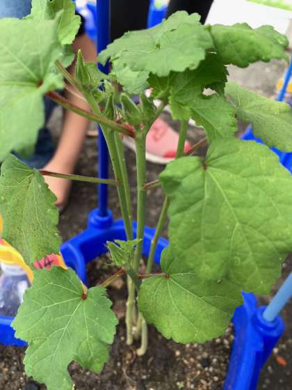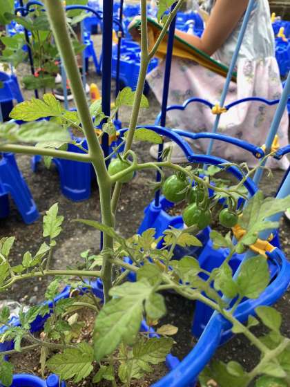 夏の日差しと梅雨の雨、子ども達からのたっぷりの愛情を浴びて、野菜が更に成長してきています。どの野菜もかわいい小さな実がなり始めました。