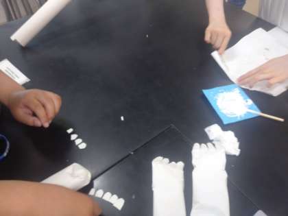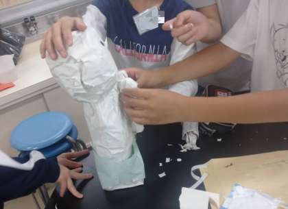 理科では、ヒトの誕生について学習をしています。班のみんなで協力して、赤ちゃんの人形をつくっています。重さはだいたい3キログラム。皮膚や手足も貼ったり付けたりしています。表情豊かな赤ちゃんの人形をつくることができました。