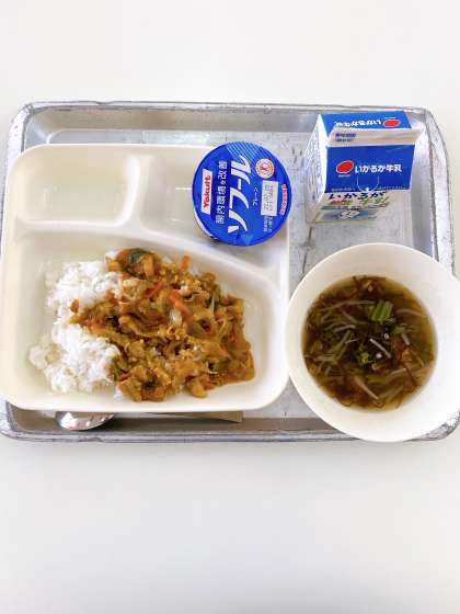 今日の給食は、和風カレー丼.もずくとオクラのとろり汁.ヨーグルト.牛乳です。もずくは、海藻で赤色のはたらきの食べ物です。ほかの海藻(も)にくっついて育つので、もずくと呼ばれます。