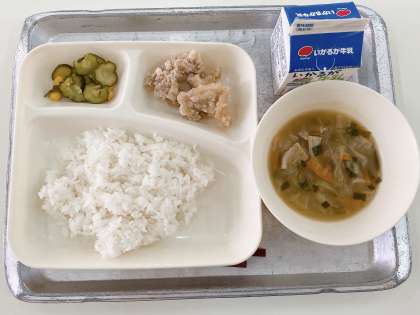 今日の給食は、鶏肉のからあげ.きゅうりとコーンの甘酢和え.中華みそスープ.ご飯.牛乳です。今日のカレンダーには、暑さに負けない食事について書かれていました。