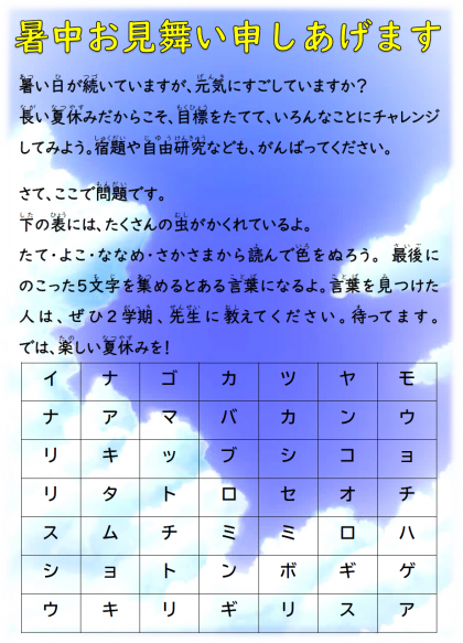 残念ながら、今年度は8月6日に子どもたちと一緒に学ぶ機会は無くなりますが、明日は、各学年から子どもたちへメッセージをこちらのHPにて掲載させていただきます。