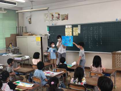 写真の様子は、夏休みに取り組んだ絵画の紹介をしているところです。みんなから大きな拍手をもらい、とっても嬉しそうでした!