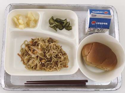今日の給食は、焼きそば.きゅうりのしょうがづけ.パインアップル缶.パン.牛乳です。