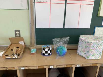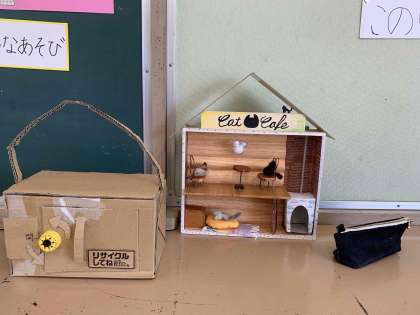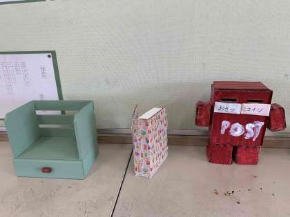 貯金箱や金庫、筆箱、ミニチュアハウス、椅子など、いろいろな作品を作ってきてくれました。特に金庫は仕掛けが本格的で、みんな興味を示していました。