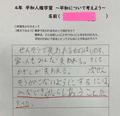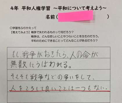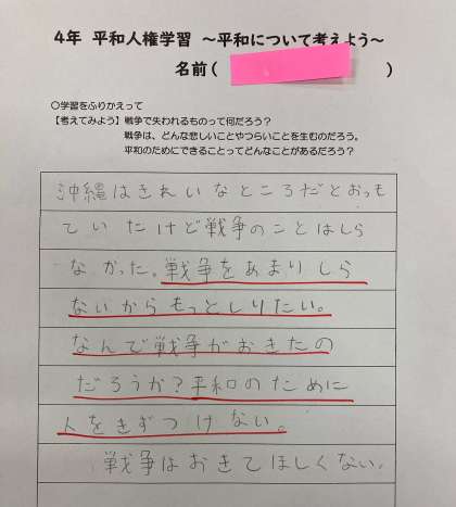 1,2時間目に平和について学習しました。1時間目は全校生で平和、戦争に関するDVDを観ました。2時間目、4年生は沖縄での戦争について学習しました。きれいな海のイメージの沖縄もかつて地上戦が行われたことを知って、子どもたちは衝撃をうけていました。写真は子どもたちの感想の一部です。しっかり考えることができました。ナイス!!!