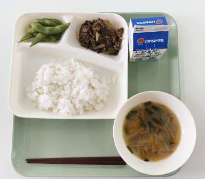 今日の給食は、プルコギ.トック.えだまめ.ご飯.牛乳です。今日は、韓国朝鮮の料理でした。