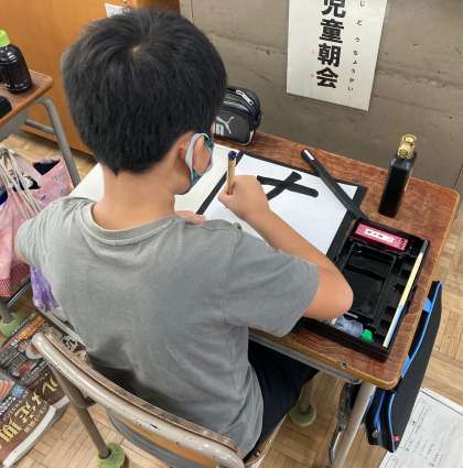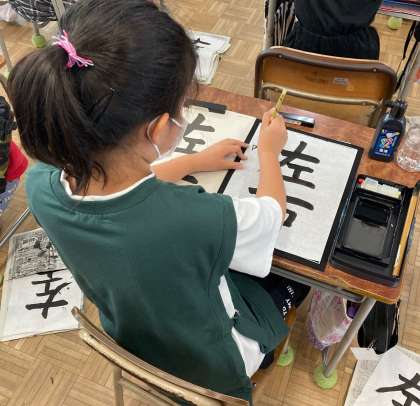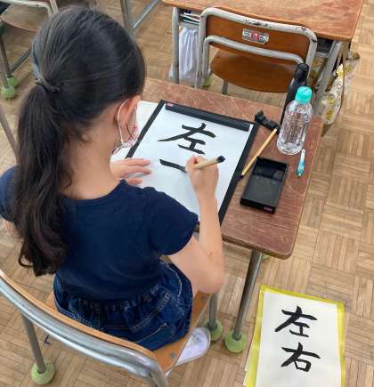習字を行いました。「左右」と書きました。書き順や横画、払いの長さに注意して書きました。美しい姿勢で書いている様子をご覧ください。ナイス!!!