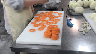 今日の献立は、牛肉の香味焼き・スープ煮・サワーキャベツ・黒糖パン・牛乳です。今日は、給食の写真に代わり、ラッキーにんじんの型抜きをしている様子を紹介します。ラッキーにんじんは、調理員さんが「苦手な子も食べられますように」と1つ1つ願い込めて、型抜きしています。苦手な食べ物にも少しずつ挑戦できるとよいですね。