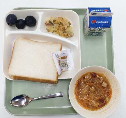 今日の給食は、豆乳マカロニグラタン.トマトスープ.巨峰.食パン.りんごジャム.牛乳です。