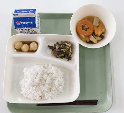 今日は、月見献立です。献立は、ひとくちがんもとさといものみそ煮.牛肉と野菜の炒め物.みたらしだんご.ご飯.牛乳です。