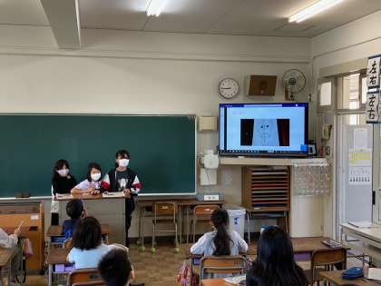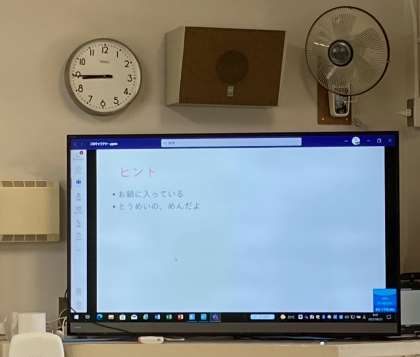 イラスト係の活動の様子です。1人1台端末を使い、パワーポイントのソフトでクイズを作りました。写真を張り付けたり、アニメーションの機能を使ったり、バッチリでした。これをチームズを使い、大型モニターに投影しました。これら全てを子どもたちだけで行いました。すごい!!ナイス!!!