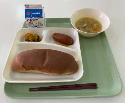 今日の給食は、フランクフルトのケチャップソース・スープ・焼きかぼちゃ・黒糖パン・牛乳です。