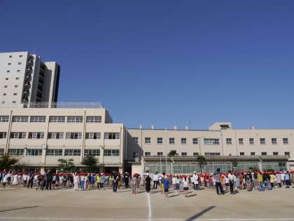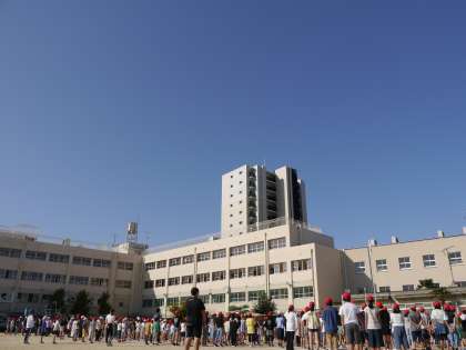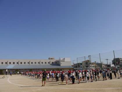 約4か月ぶりの運動場で行いました。マスクの着用や子どもたちの間隔の確保など、感染対策をとっています。雲一つない秋晴れのもとの朝会でした。