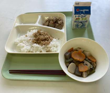 今日の献立は、豚肉のねぎじょうゆ焼き.ふきよせ煮.ツナ大豆そぼろ.ご飯.牛乳です。