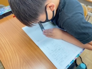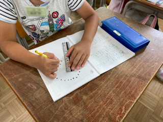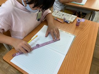 算数科「円と球」でまるい形について考えました。中心の点をかき、そこから5センチメートルのところに・をとり、まるい形をかいていきました。初めての慣れない活動にも真剣に取り組むことができました。