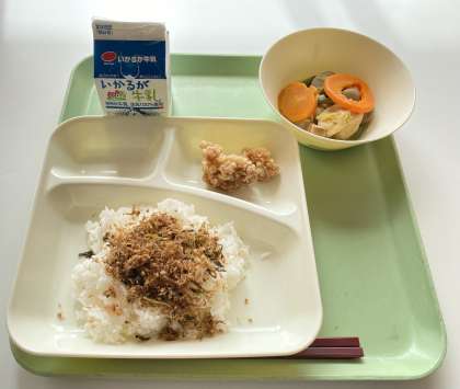 今日の給食は、鶏肉の竜田揚げ.一口がんもと野菜の煮物.おかか菜っぱ.ご飯.牛乳です。