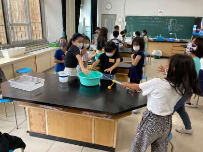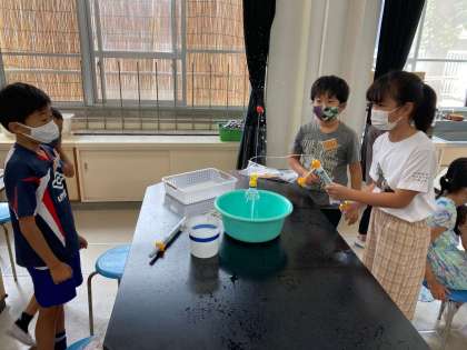今日は、空気と水を使った実験を行いました。