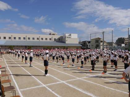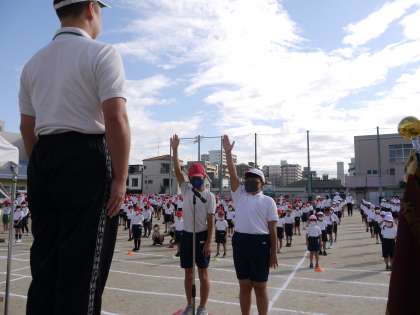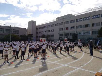 開会式です。運動場に整列し、児童代表による誓いの言葉、よさみストレッチなどを行いました。