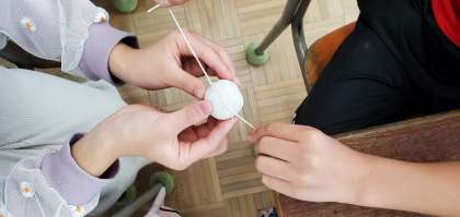 3年生の子どもたちは、球(きゅう)を実際に糸で切り、断面の形を調べる活動を通して、球の定義について考えました。「うわぁ!円になるよ。」といった発見をしたようです。明日の学習も楽しみですね!