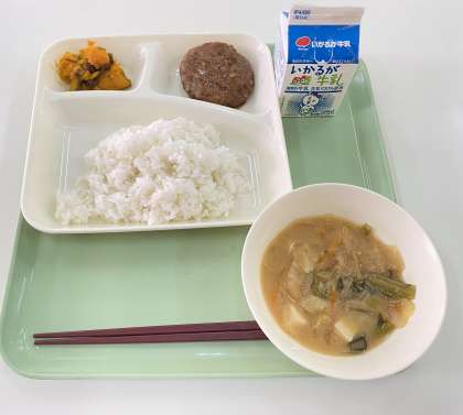 和風ハンバーグ.かぼちゃのいとこ煮.豆腐のみそ汁.ご飯.牛乳です。