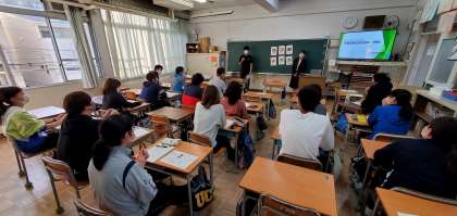 研修に先立ち、本校の英語担当教諭が英語で自己紹介を行いました。その後、アイスブレイクされた和やかな雰囲気の中で研修が進められました。