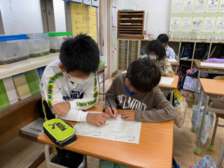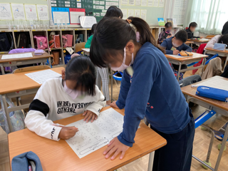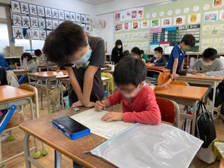 朝の学習で算数プリントに取り組んでいる様子です。問題が解き終わったら、わからない友だちにミニ先生をしている子がたくさんいてました。ナイス!