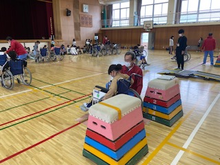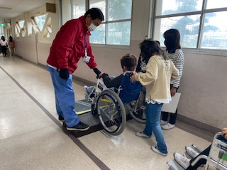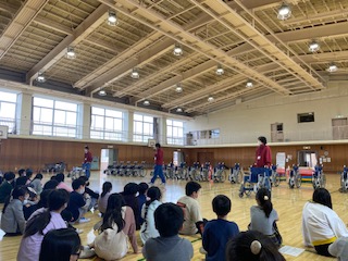 大阪市立心身障害者リハビリステーションセンターの方々に来ていただき、車いす体験を行いました。どういった人が車いすを使うのか、車いすの介助の仕方など、貴重なお話もしていただきました。